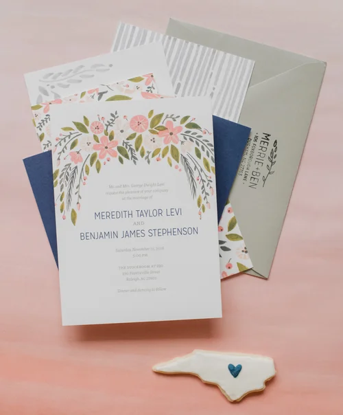 For their wedding, Merrie and Ben wanted invitations that balanced the traditional and the modern, fit with the relaxed feel of their venue, and that were romantic without being girly.